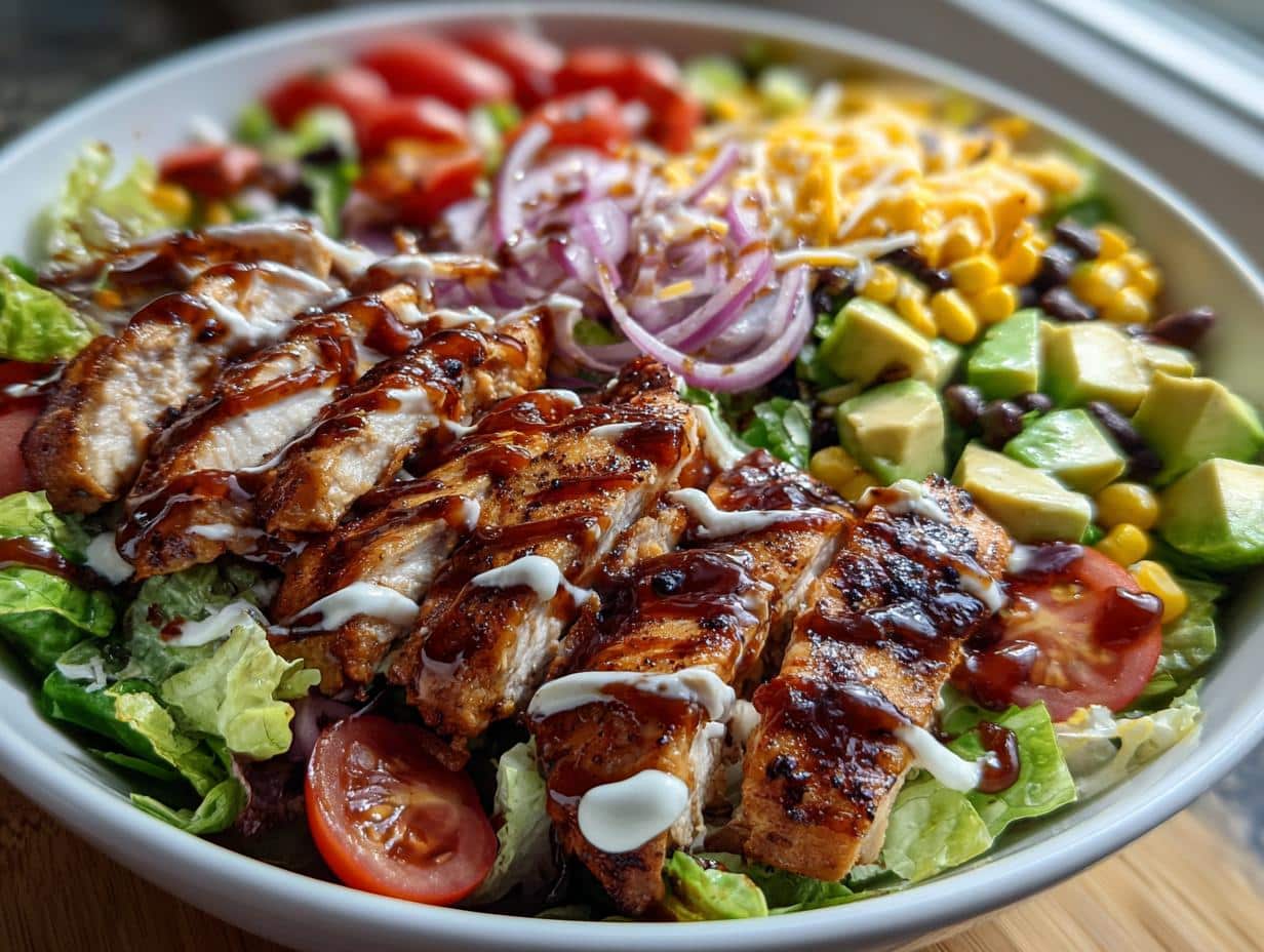 A fresh and flavorful BBQ chicken salad with crisp vegetables and tender grilled chicken.
