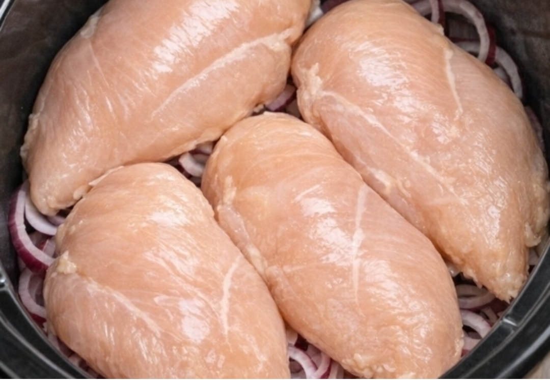 Slice the red onion into thick, vibrant crimson rings and lay them in an even layer on the bottom of the slow cooker. This makes a flavorful bed that keeps the chicken off the direct heat and adds moisture.
