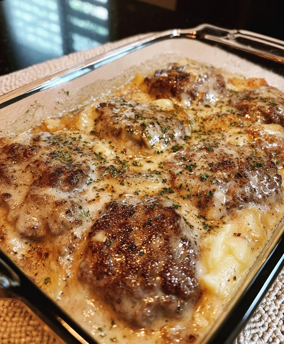 3. Brown Steaks: Heat olive oil in a large skillet over medium heat. Brown the patties on both sides, about 2-3 minutes per side. Transfer to the baking dish.