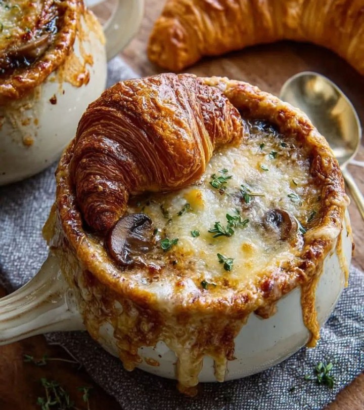 Anti-Inflammatory French Onion Soup with Mushrooms, Extra Herbs & Cheesy Croissant Topping