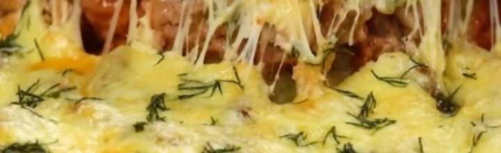 Here is a delicious baked meat & cheese casserole recipe inspired by your photo — juicy meat, rich sauce, and lots of melted cheese with dill on top.
