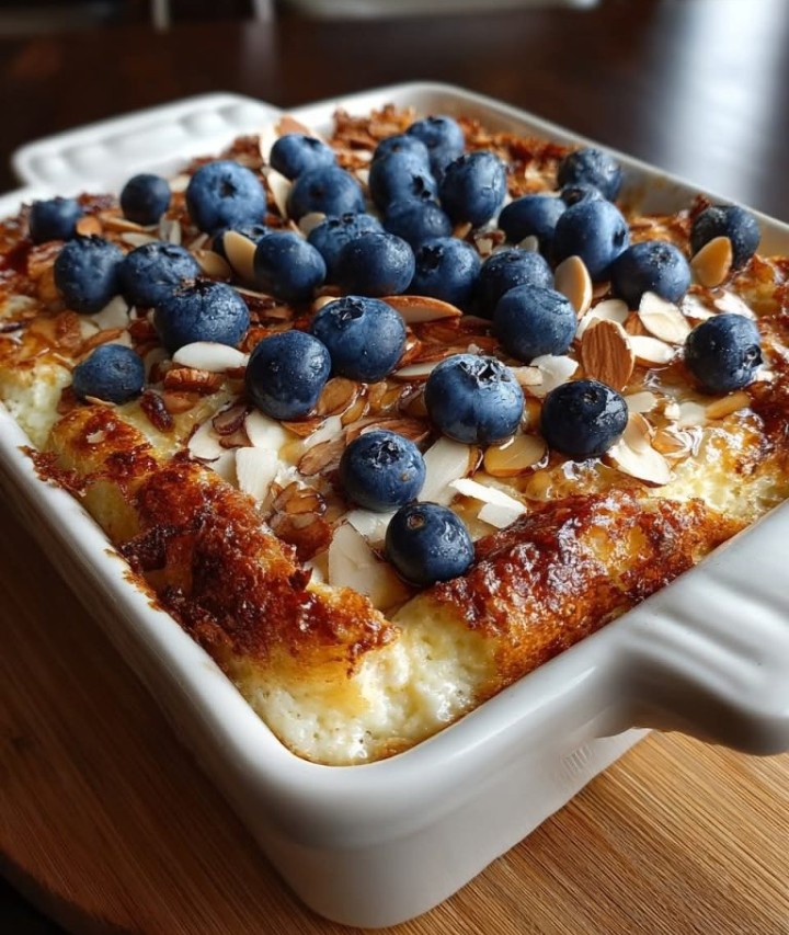 - Top with Blueberries and Almonds: Scatter fresh blueberries over the top of the casserole, and sprinkle sliced almonds evenly on top as well.