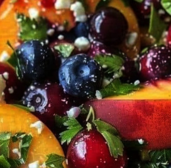 In a large bowl, combine mixed greens, peach slices, blueberries, feta cheese, and pecans.