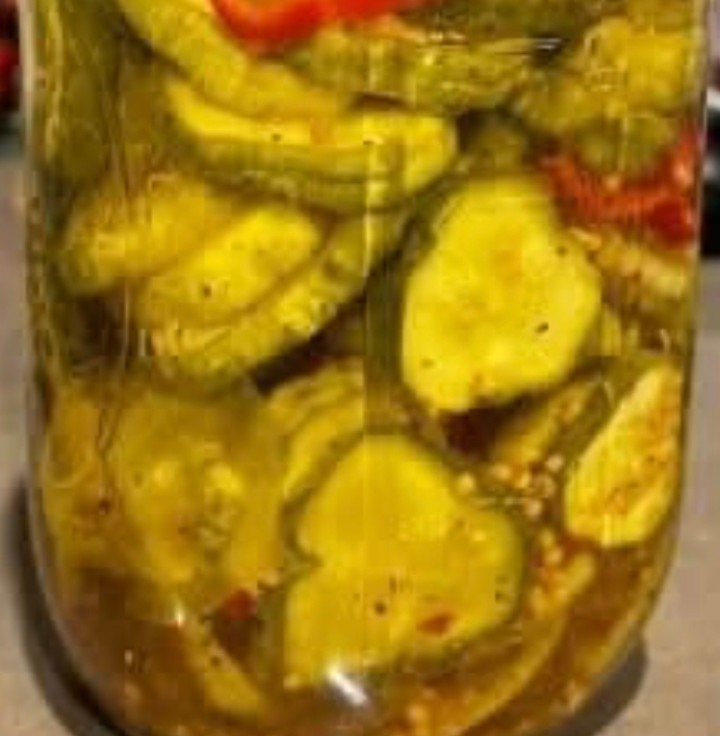 A brine is prepared by heating vinegar, sugar, salt, and spices such as mustard seeds, celery seeds, and turmeric, which adds color and flavor to the pickles. The brine is poured over the cucumbers and onions, and the mixture is left to sit and marinate in the refrigerator for several hours or days, allowing the flavors to meld together.