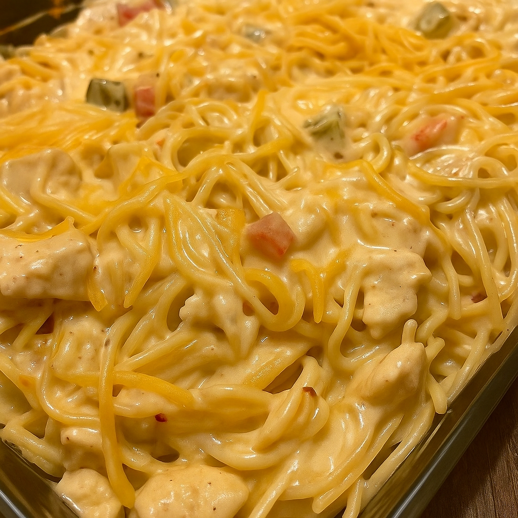 This Cheesy Chicken Spaghetti is a creamy, comforting casserole loaded with tender chicken, spaghetti noodles, and a rich, cheesy sauce. Made with pantry staples and bursting with flavor from diced tomatoes and peppers, it’s a Southern favorite that’s perfect for weeknight dinners or feeding a crowd.