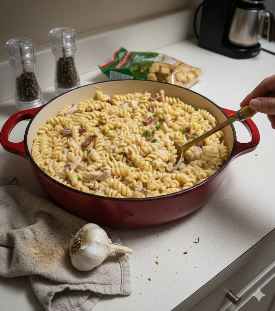 Add cooked pasta, diced chicken, crispy bacon, and remaining cheese. Stir to combine and let simmer for 2–3 minutes until heated through. - Garnish & Serve