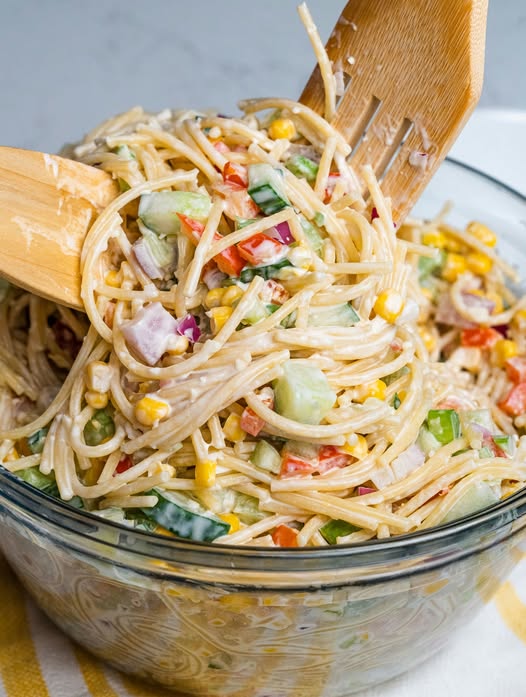 There’s something undeniably comforting about a creamy pasta salad, and this one brings both nostalgia and a playful spin to the table. With crunchy vegetables, tender spaghetti, and a tangy, savory dressing, this Confetti Salad lives up to its name—bright, festive, and full of flavor.
