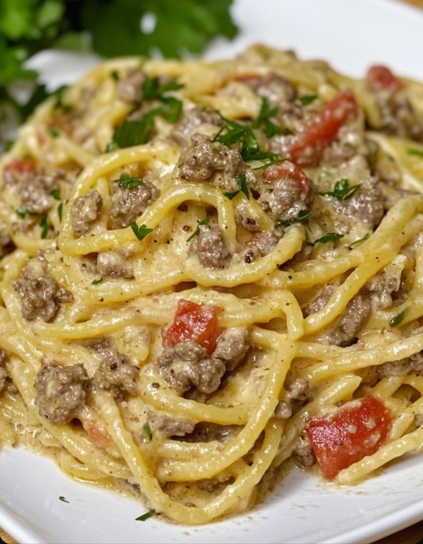 Garnish the Creamy Italian Spaghetti & Ground Beef with freshly chopped parsley. Serve it hot and enjoy the delightful combination of flavors in every bite!