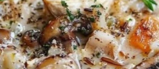 - Pour in the chicken broth and wild rice. If using soaked dried mushrooms, add the chopped mushrooms and their soaking liquid here.