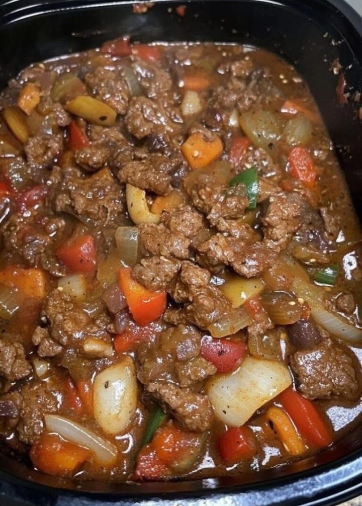 - Mix the onions and browned beef into the crockpot, and stir to combine all of the ingredients well. Cook on high for 3 hours or low for 6-7.