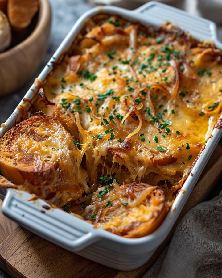 This French Onion Soup Casserole takes the deeply savory, cheesy, and comforting flavors of the classic French soup and transforms them into a hearty, easy-to-serve baked casserole. It features layers of caramelized onions, rich broth, toasted bread, and a blanket of melted Gruyère and Parmesan cheese.