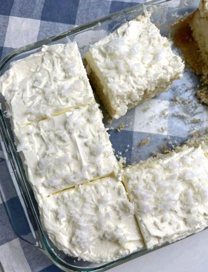 6. Step 6: Frost & Garnish: Spread the whipped cream over the cooled cake and sprinkle with additional shredded coconut. Slice into squares and serve.