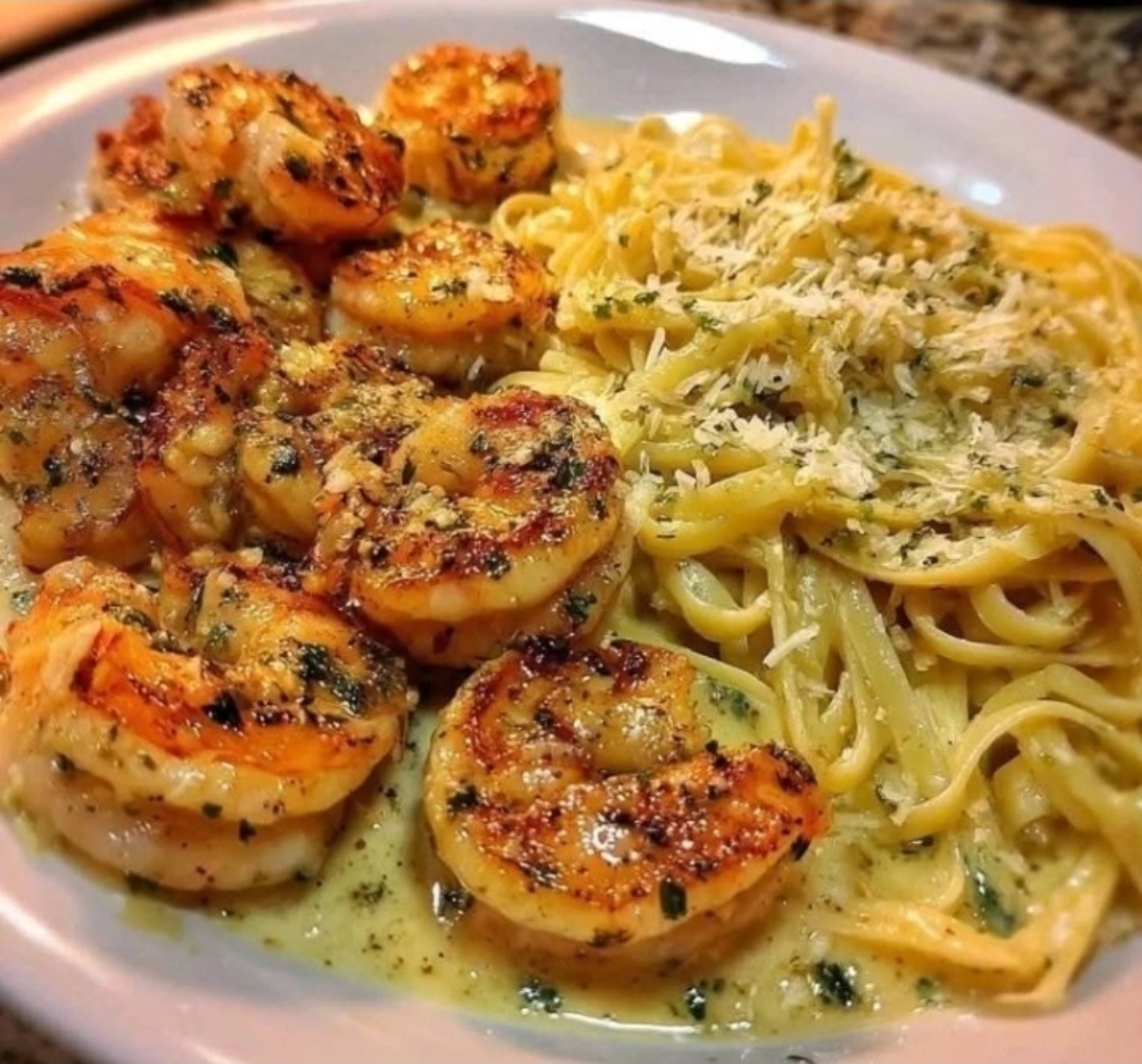 GARLIC BUTTER SHRIMP WITH CREAMY GARLIC PARMESAN LINGUINE