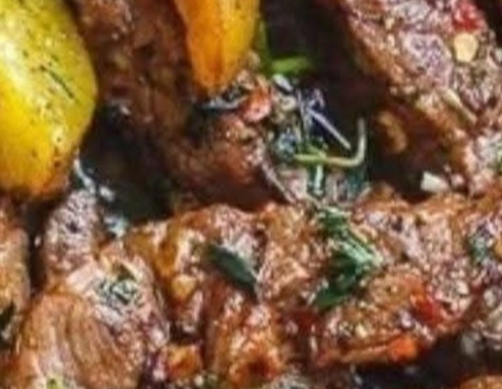 Steak of your choice (ribeye, sirloin, or filet), baby potatoes halved, olive oil, butter, minced garlic, fresh thyme or rosemary, salt, black pepper, and chopped parsley for garnish.