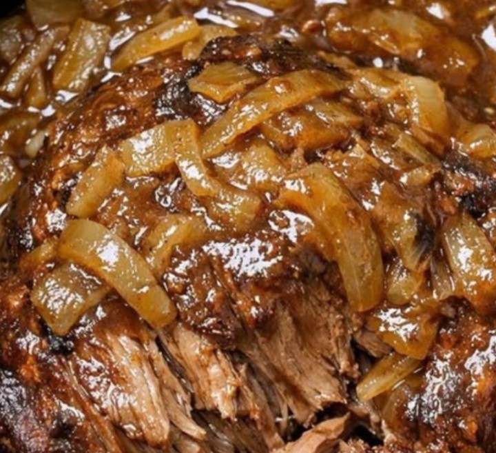Serve this pot roast straight from the slow cooker, spooning the onions and glossy brown gravy over each portion of beef. It’s wonderful over creamy mashed potatoes, buttered egg noodles, or a bed of rice to catch all the juices. Add a simple green side—steamed green beans, roasted carrots, or a crisp salad with a tangy vinaigrette—to balance the richness. A slice of crusty bread is perfect for mopping up the extra gravy, and if you enjoy wine, a medium-bodied red like a Merlot or Cabernet Franc pairs nicely with the savory onion flavors.