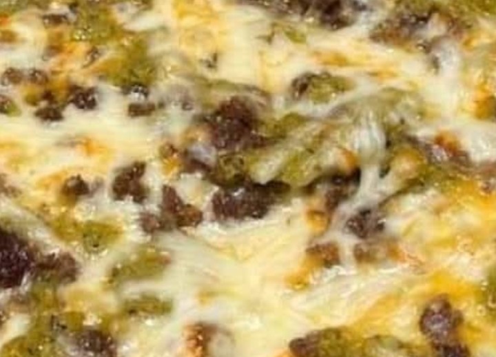 - In the cast iron skillet, layer the tortillas with the green chile, cheeses, onion, and seasonings.