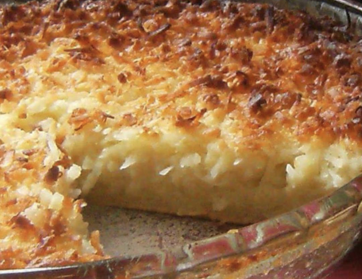 Combine all ingredients and pour into 9 inch buttered pie pan. Bake at 400 degrees for 25-30 minutes until custard sets. Like magic it layers into crust, custard, coconut topping. Cool.