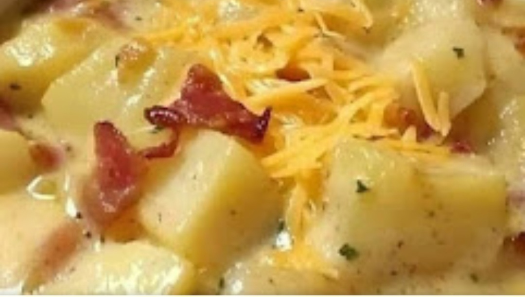 In a 4-quart saucepan on medium-high heat add potatoes, cover with water (about 3-4 cups) and allow to fully cook. Add milk, chicken cubes, onions, parsley, garlic basil, salt, pepper, hour sauce and 1 piece of bacon. Mix well. Quickly add flour mixing until no lumps appear and mixture thickens. Reduce heat to low cover and allow to cook for 10 minutes occasionally stirring. Add cheese, mix until melted.