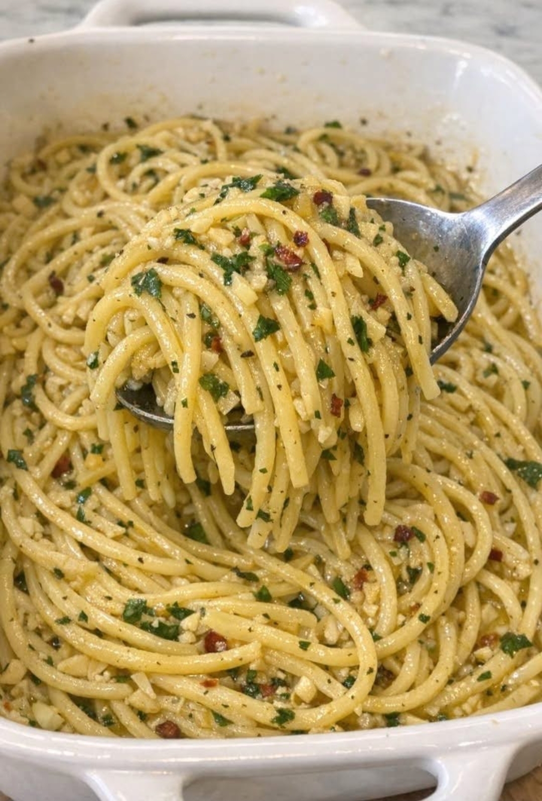 Give the pasta a final toss in the dish so every strand gets coated in the buttery, garlicky herbs. Let it sit for 3–5 minutes to thicken slightly, then serve straight from the casserole dish with a big spoon, scooping up plenty of buttery sauce and herbs with each portion.