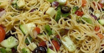 Ingredients: °1 lb spaghetti, cook & drain °1 1/2 cup cherry tomatoes, halved °1 cucumber, diced °2 zucchini, diced °1…