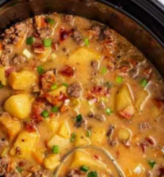 About 30 minutes before serving, brown the minced meat. Drain off the fat and add it to the slow cooker. Fry and chop the bacon, and transfer the chopped bacon to the slow cooker. You can also bake the bacon in the oven at any time while the soup is cooking and set it aside for later