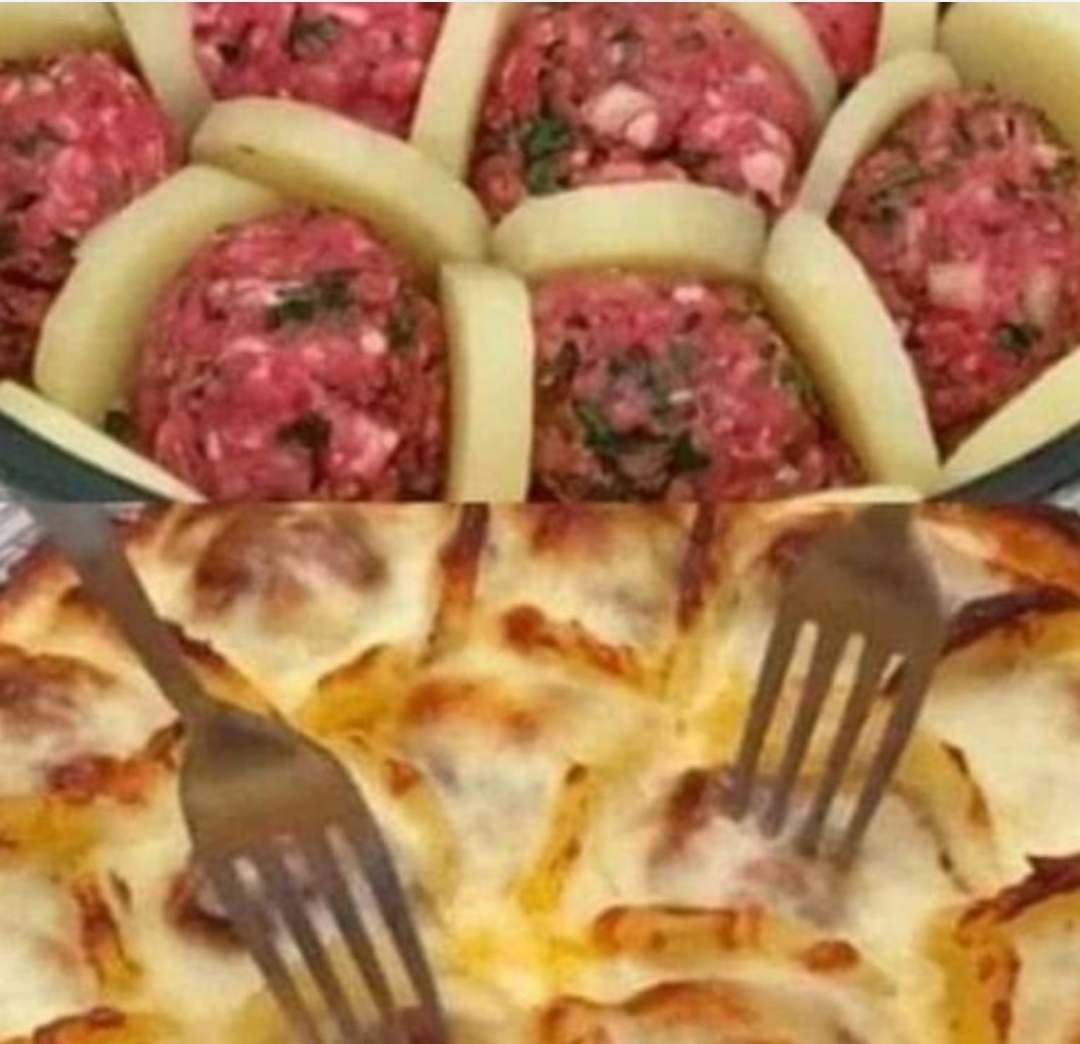 Use the remaining potato slices to separate the meatballs and form small portions.