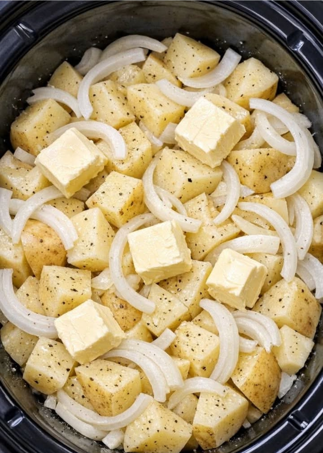 - Place the cubed potatoes at the bottom of the slow cooker.