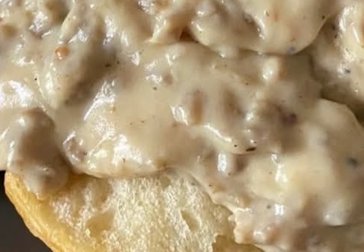 Serve hot spooned generously over warm split biscuits.