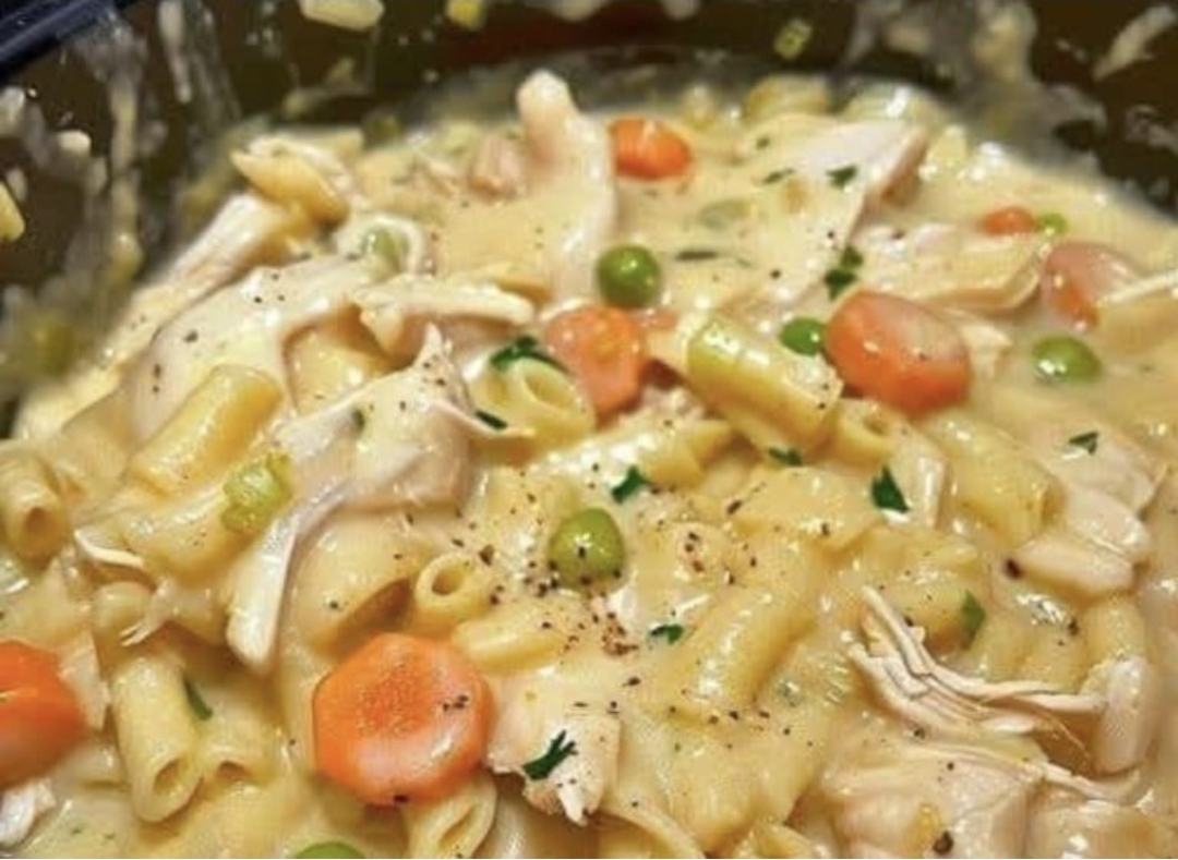 Skillet dish with chicken, noodles, and vegetables