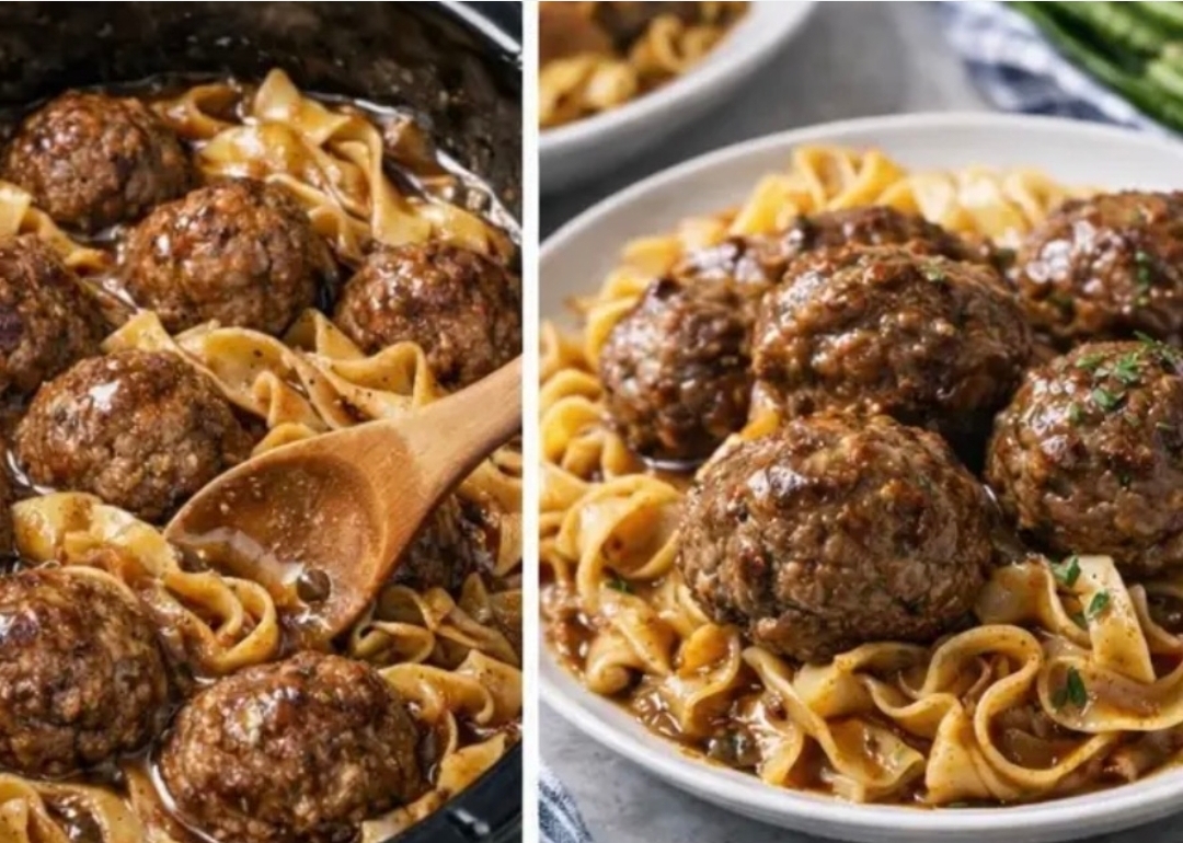 Slow-Cooked Meatball Stroganoff with Noodles is a rich, comforting dish made with tender meatballs simmered slowly in a savory mushroom and beef gravy. The slow cooker allows the flavors to develop beautifully while keeping the meatballs juicy and soft. Served over warm egg noodles, this dish delivers creamy, hearty comfort food that is perfect for family dinners, cozy weekends, or easy meal prep.