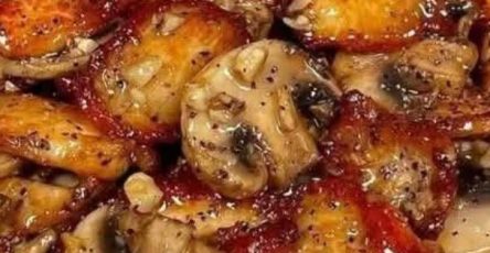 Add the red wine to the skillet scraping down the brown bits on the side. Allow it to simmer and reduce and slowly add chicken broth, and tomato sauce, and soy sauce. Slowly whisk in the flour. Add the sauce to the slow cooker.
