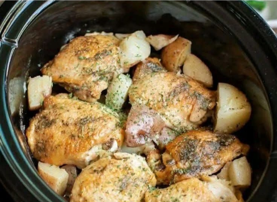 Once done, remove the chicken thighs and potatoes from the slow cooker. Serve hot, garnished with freshly chopped parsley.