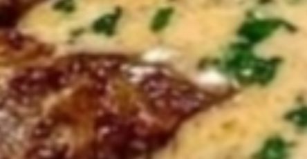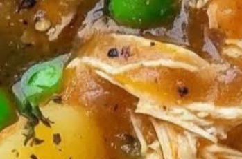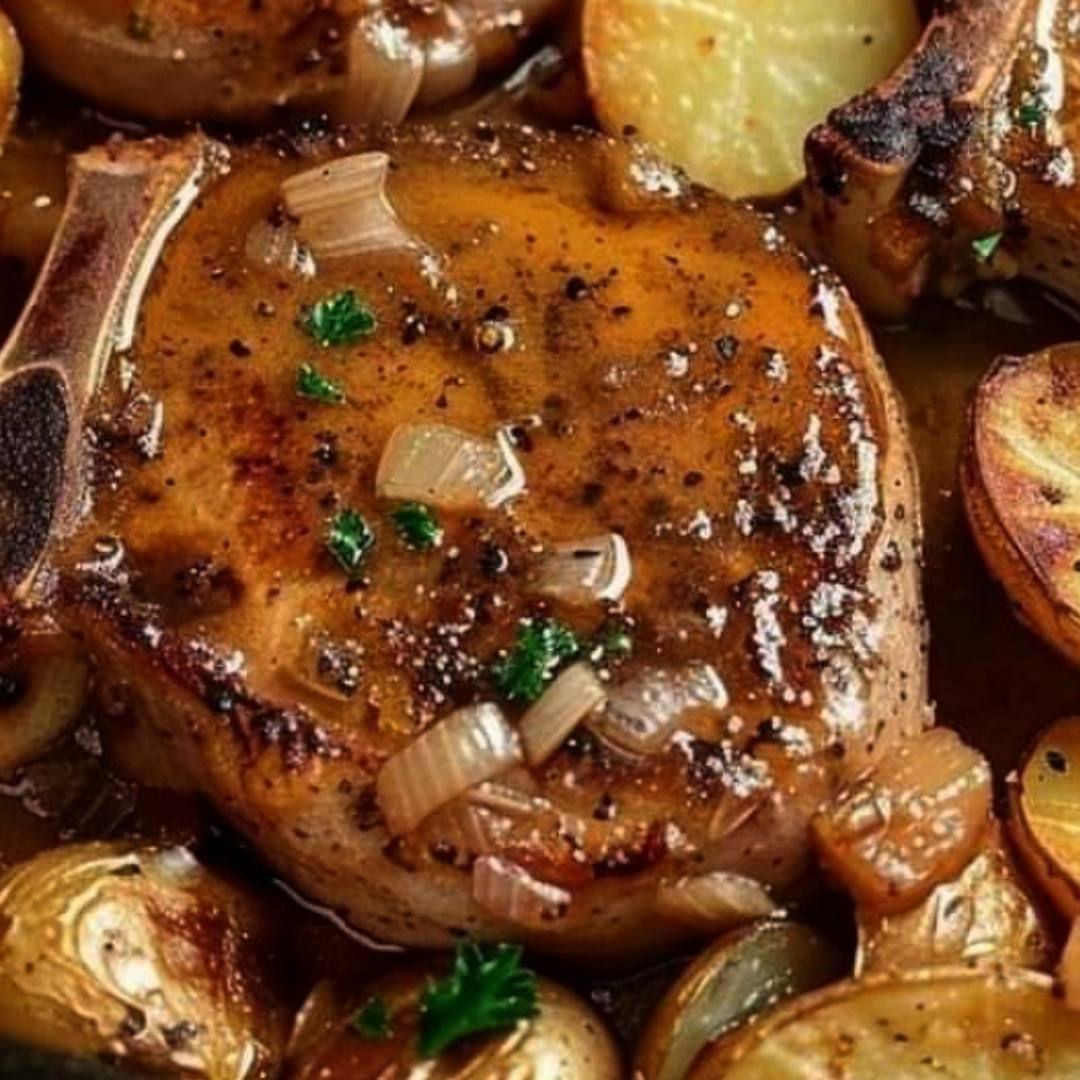 After the pork chops have cooked, arrange them on top of the potatoes. Pour the soup mixture over the chops.