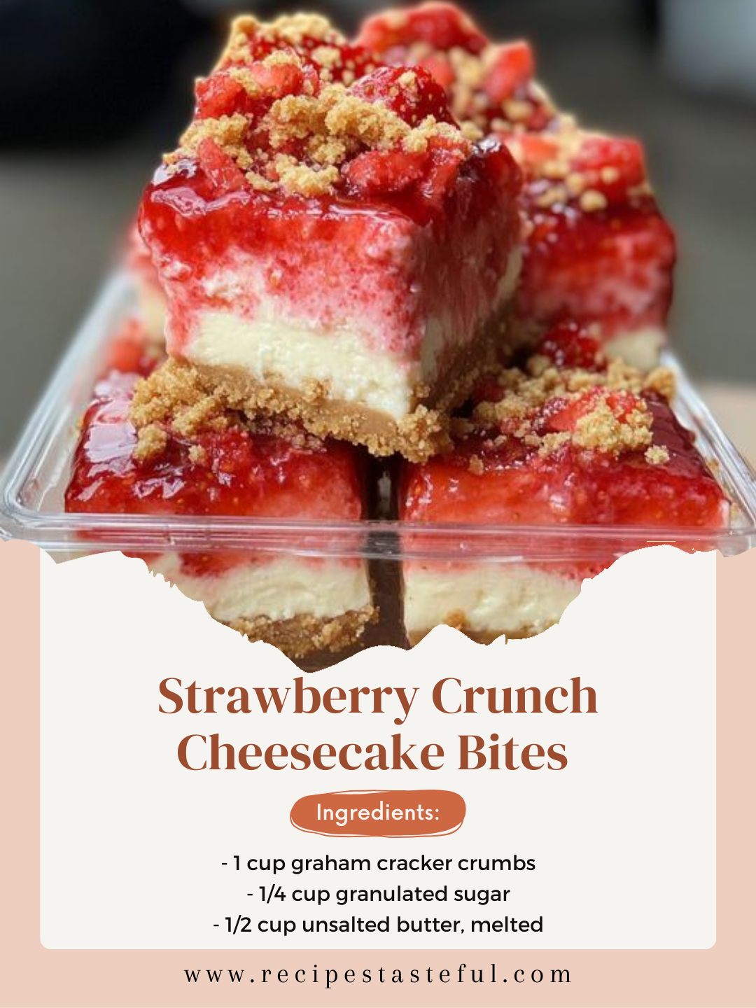 These Strawberry Crunch Cheesecake Bites are creamy, fruity, and perfect for any occasion. Enjoy the sweet crunch and creamy strawberry flavor!