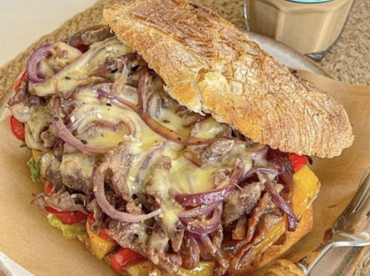 This delicious sandwich combines tender slices of beef, caramelized onions, and melted cheese, all packed between a crispy, fresh baguette. It’s the perfect choice for a hearty and flavorful meal that will satisfy your hunger and cravings.