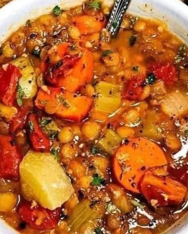 1 medium onion diced, about 1 1/2 cups2 carrots sliced, about 1 1/4 cups2 celery stalks diced, about 1 cup1 medium white potato diced, about 1 1/2 cups3 cloves garlic minced28 ounce can diced tomatoes1 1/2 cups dried brown lentils rinse1 1/2 teaspoon Italian seasonings1 teaspoon dried thyme1 teaspoon lemon pepper1/4 teaspoon ground black pepper1 teaspoon salt1 1/2 teaspoon lemon juice1 Tablespoon balsamic vinegar5 cups vegetable broth dividedsalt and pepper to tastemore broth to thin soup after cooking